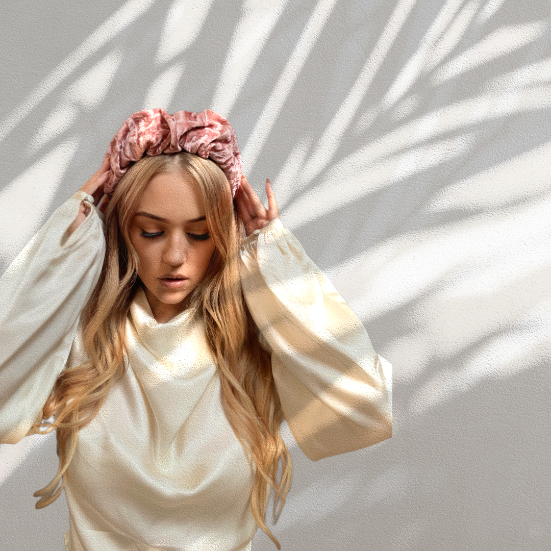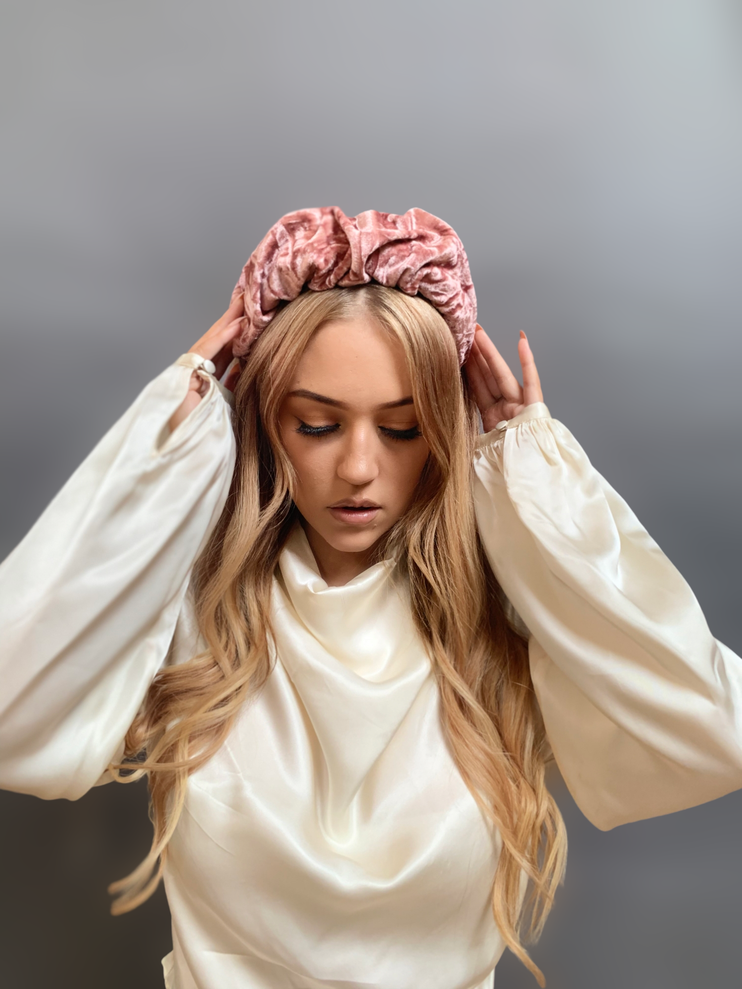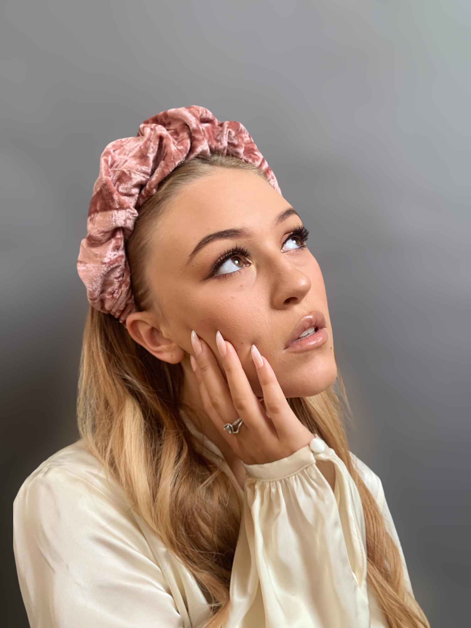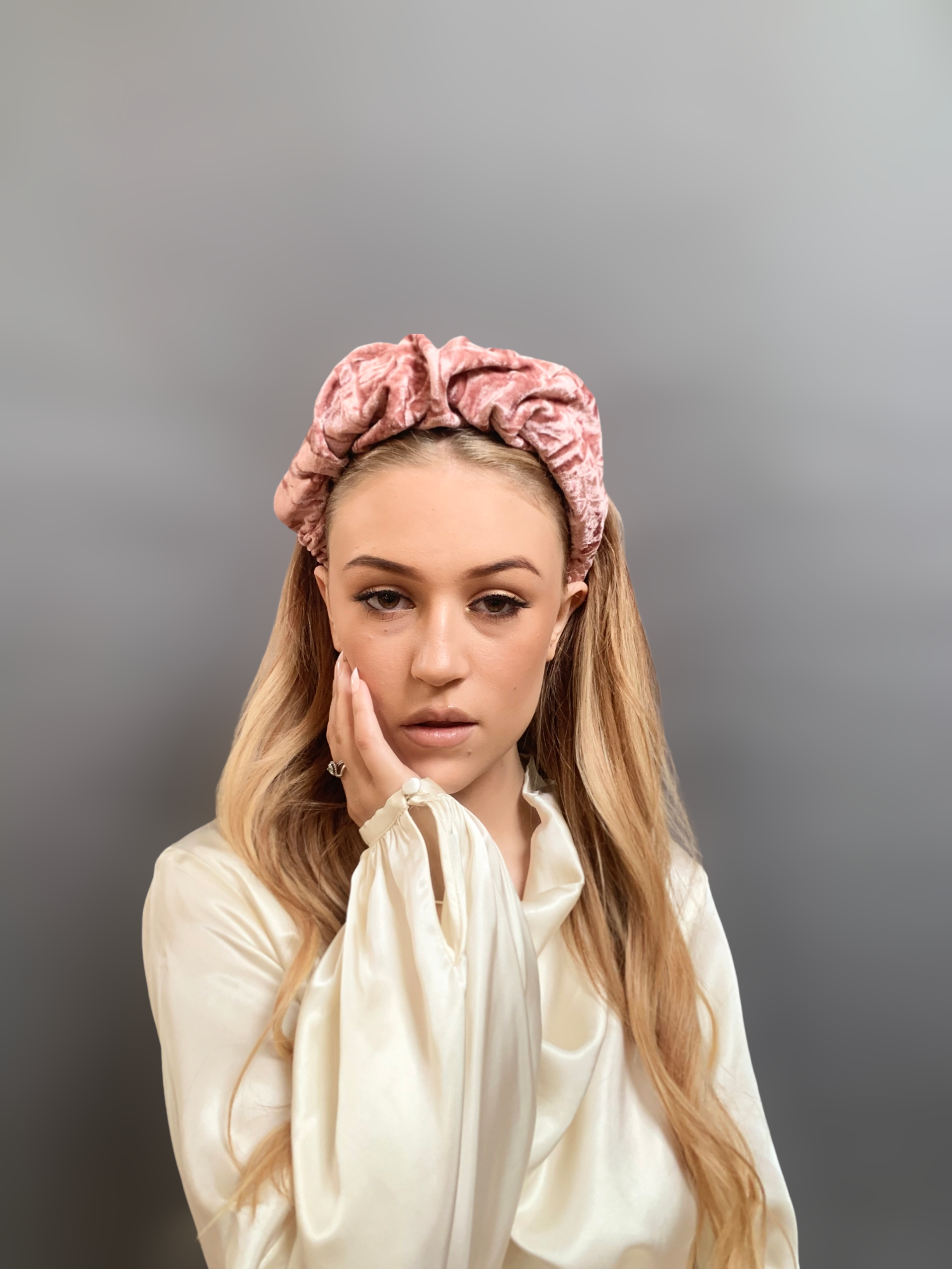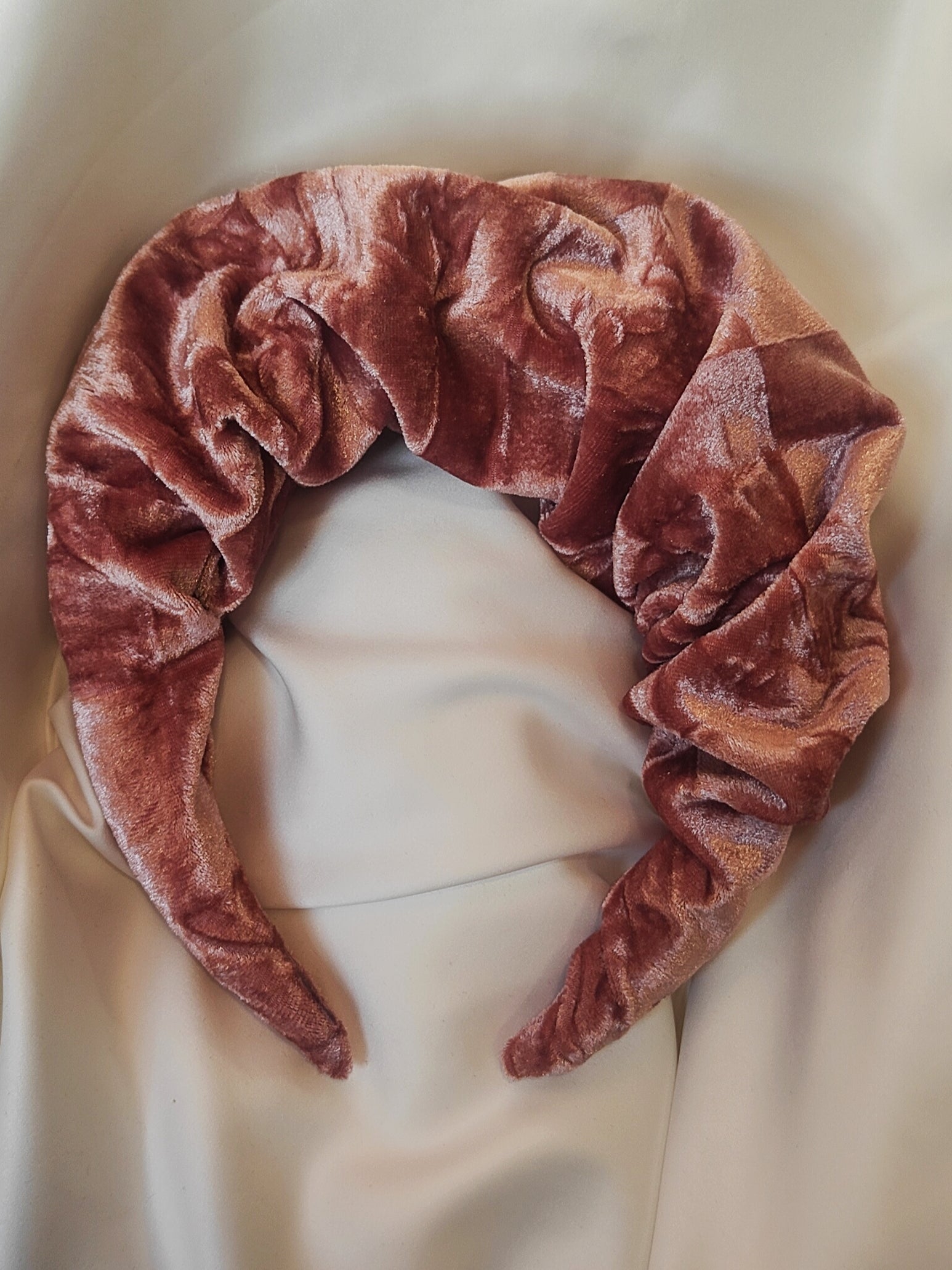 Cruthaítear an PINCRUSHED RUFFLE HEADBAND as fabraic veilbhit brúite bog i scáth bándearg bog deannaigh. Déantar an fhabraic a mhúnlú go cúramach, a fhuaite agus a shocrú ar bhanda cloigeann padded a thugann neart Oomph don phíosa seo!