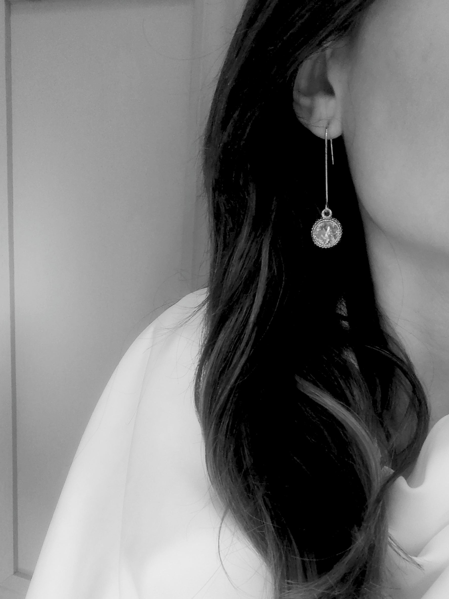 A shining round gem on a gold frame suspended from an 18ct gold-plated long hook earring.