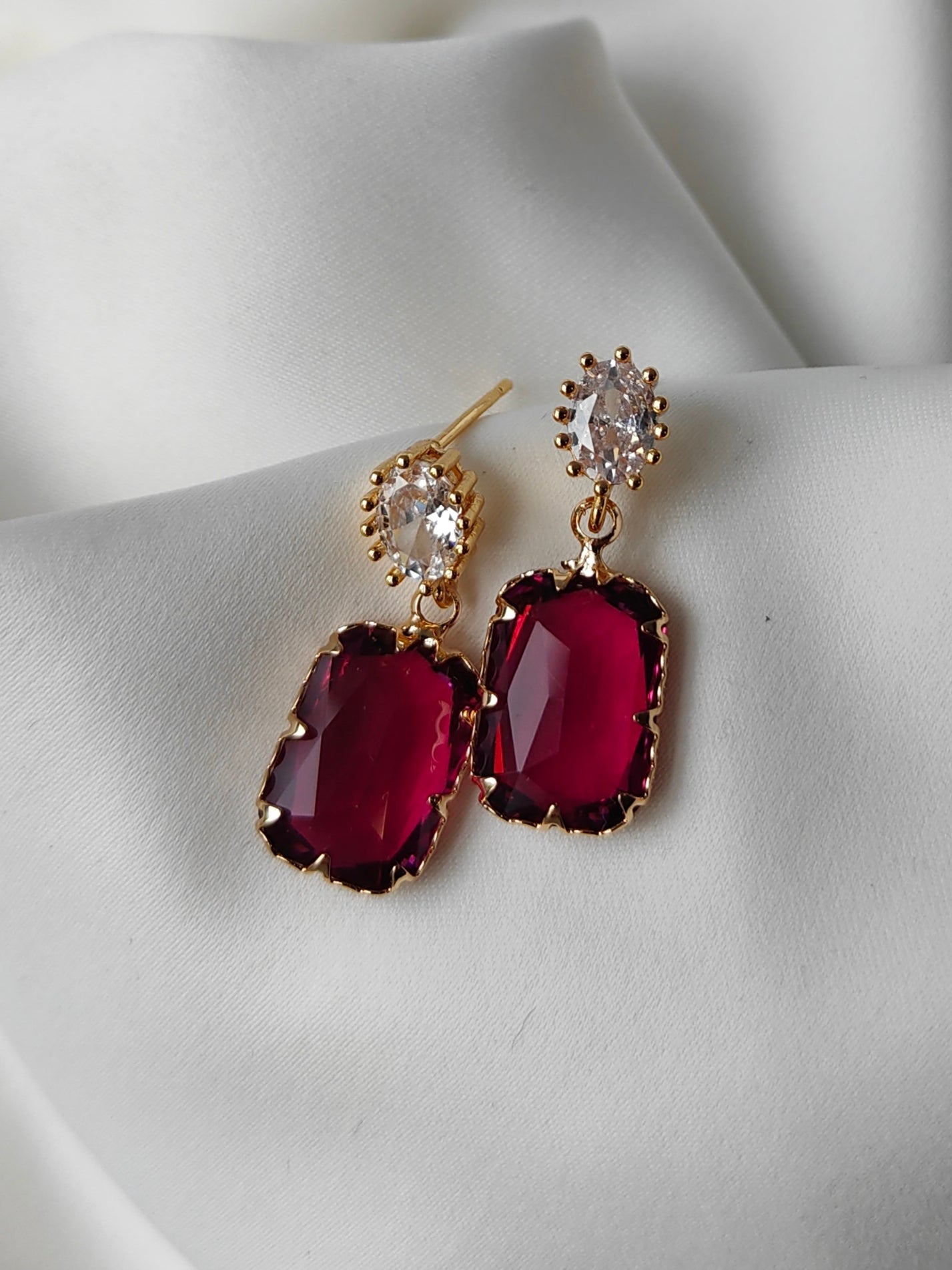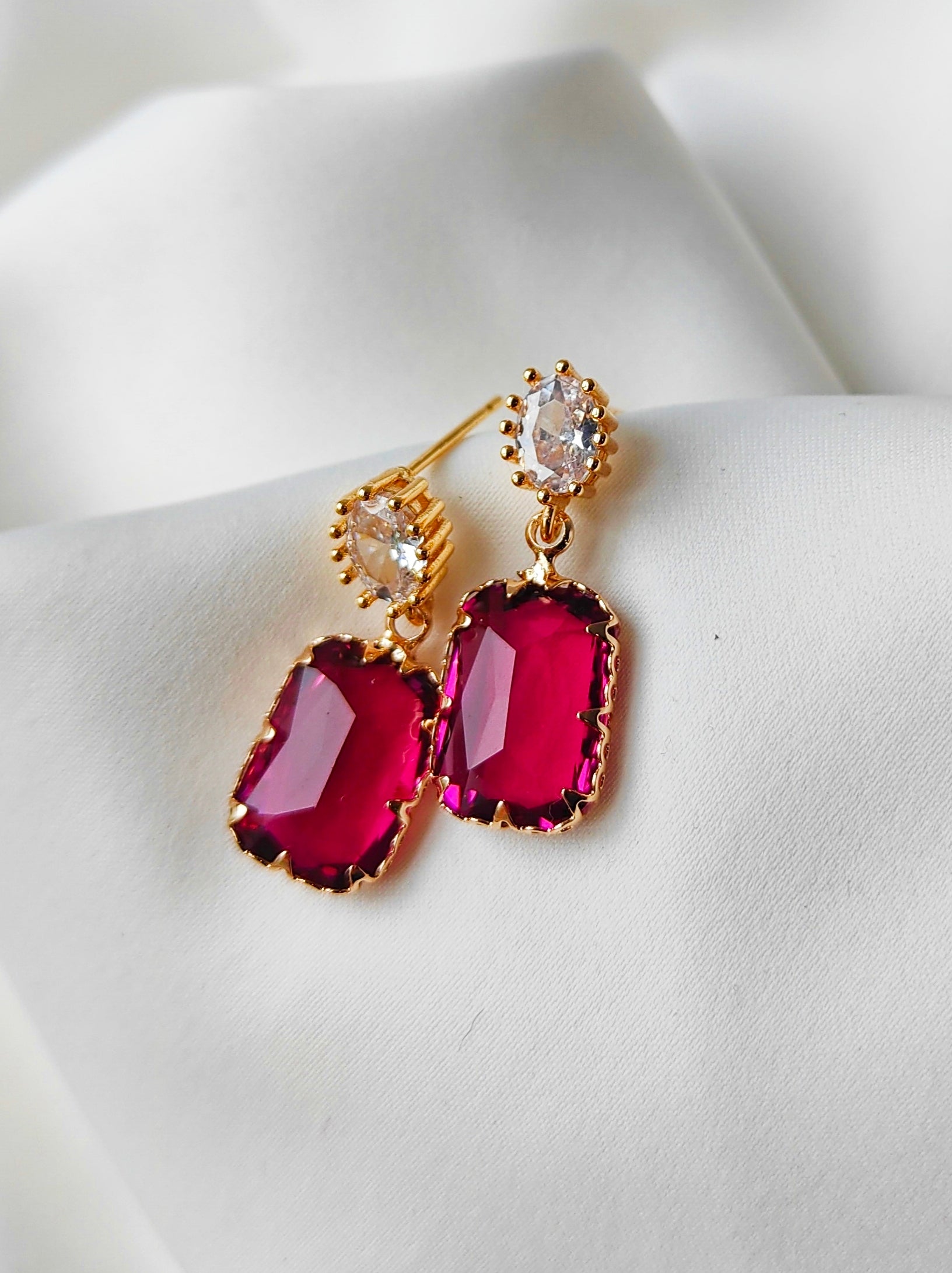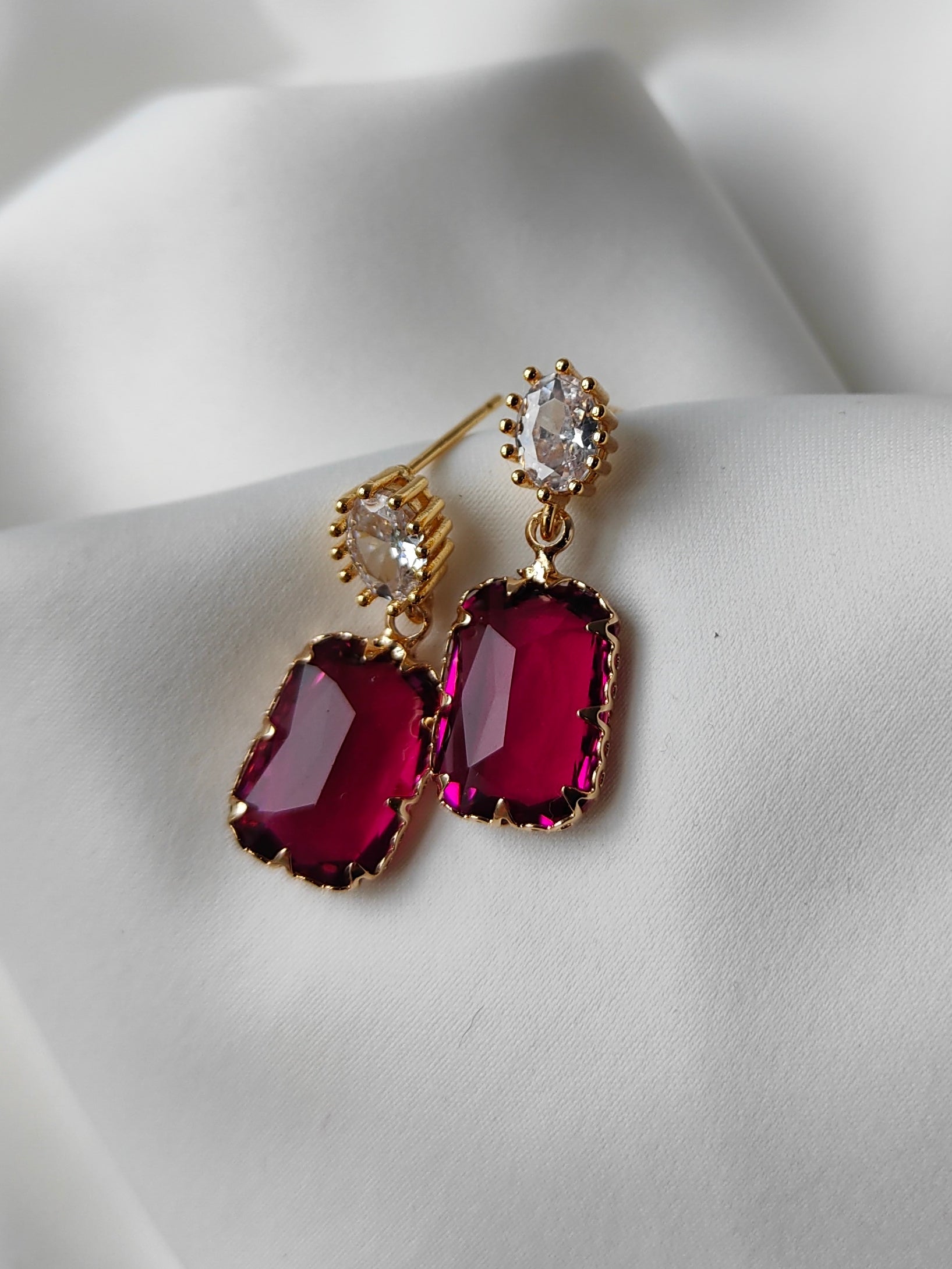 An oval crystal stud featuring a faceted rectangular drop gem below. These classic beauts are the perfect finishing touch.