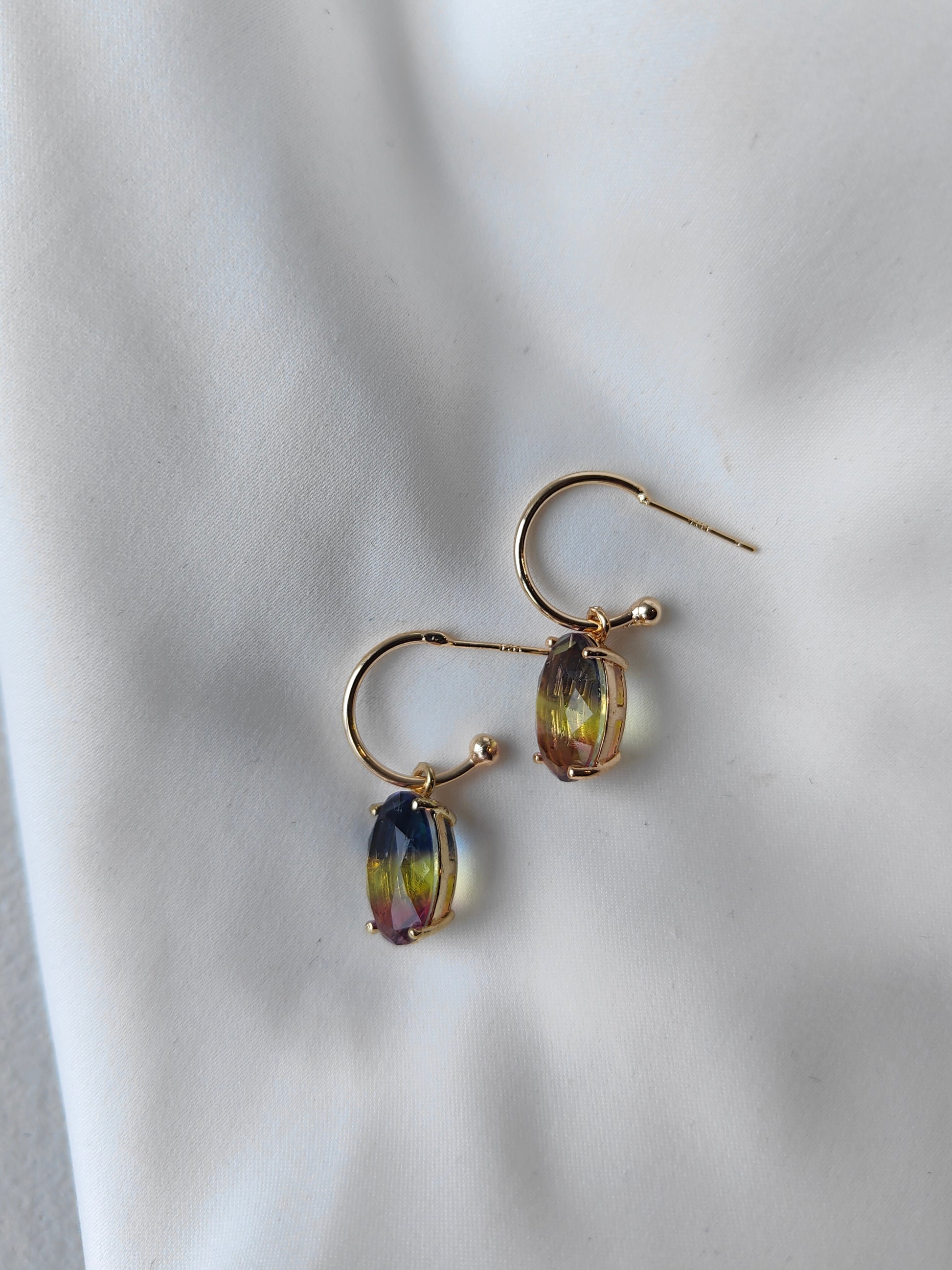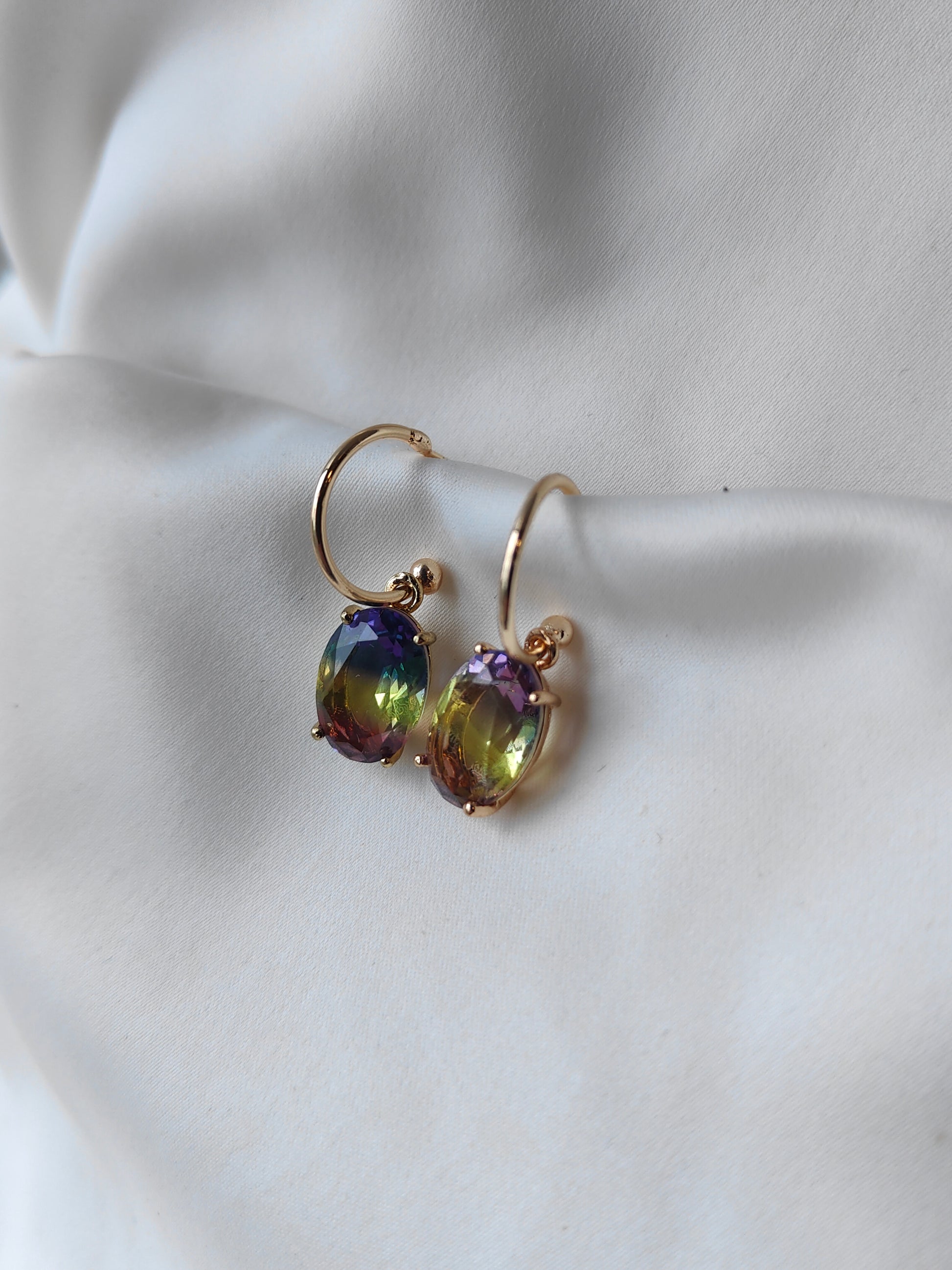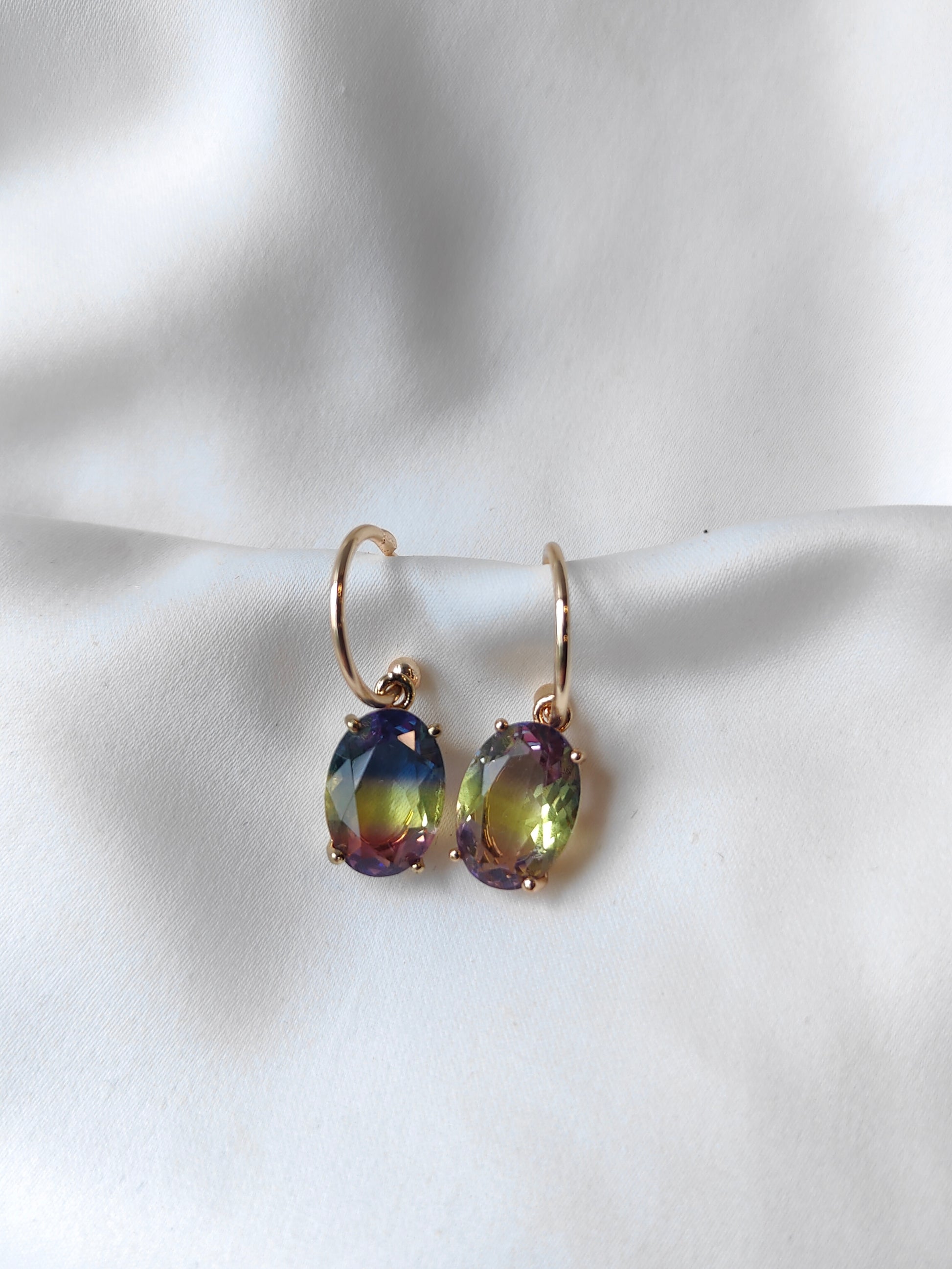 Add a touch of colour to your outtfit with these beautiful 18t gold plated hoop earrings featuring stunning ombre oval crystals on a gold setting. These classic beauts are perfect for a dinner date, as a touch of everyday class or a finishing touch for a grand event.