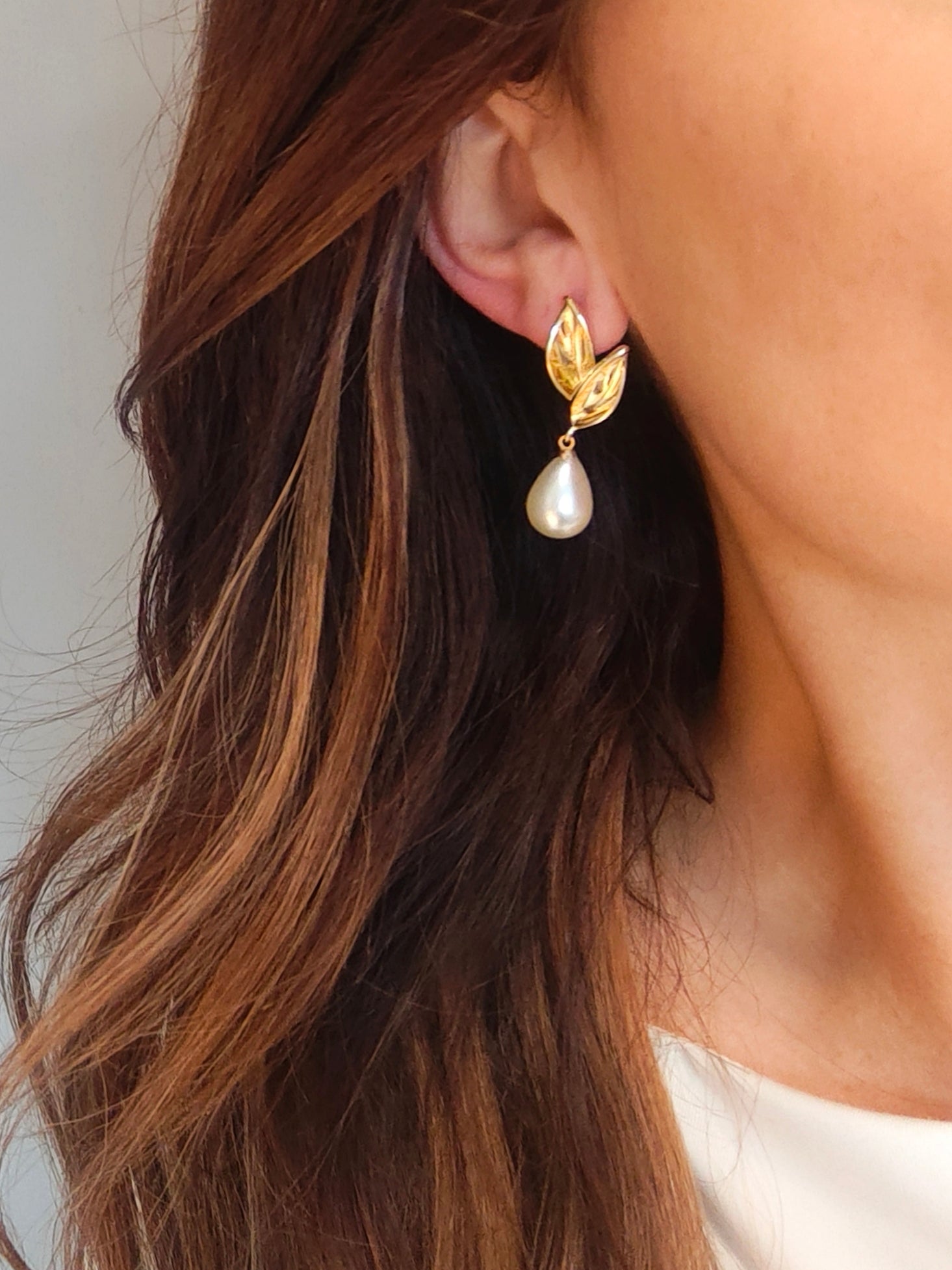 A teardrop ivory pearl suspended from an 18ct gold plated floral stud.