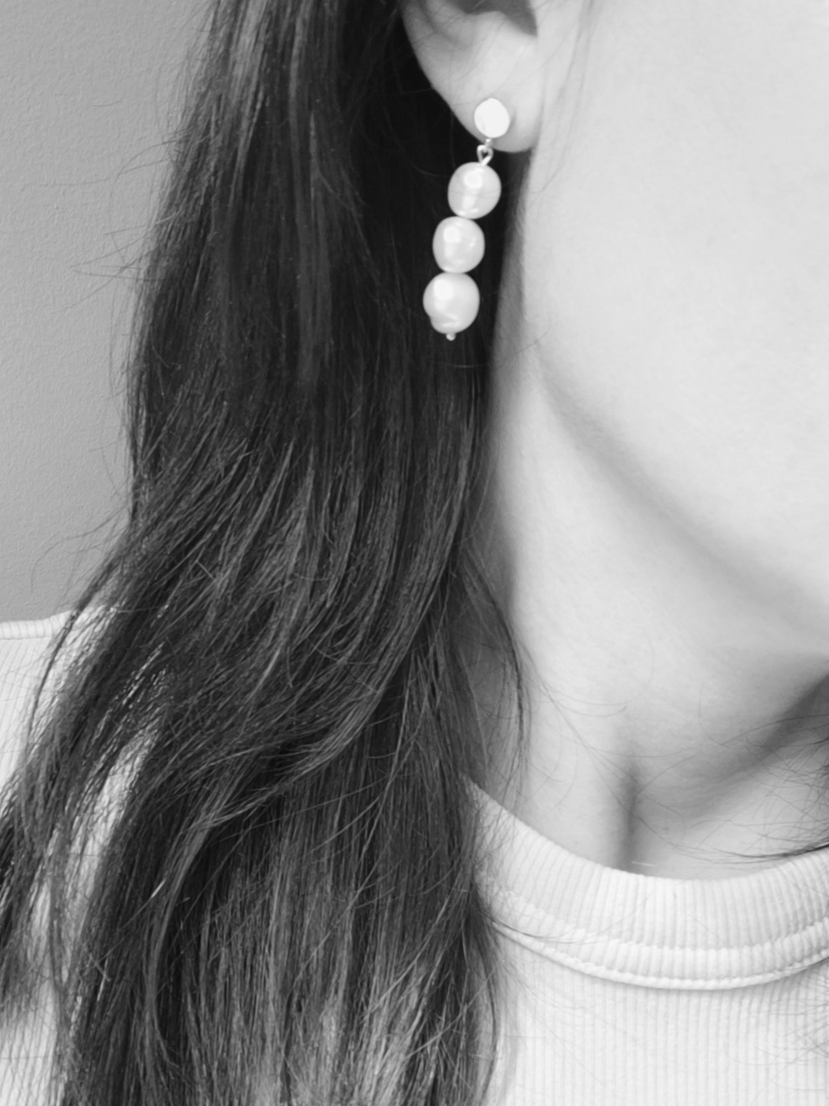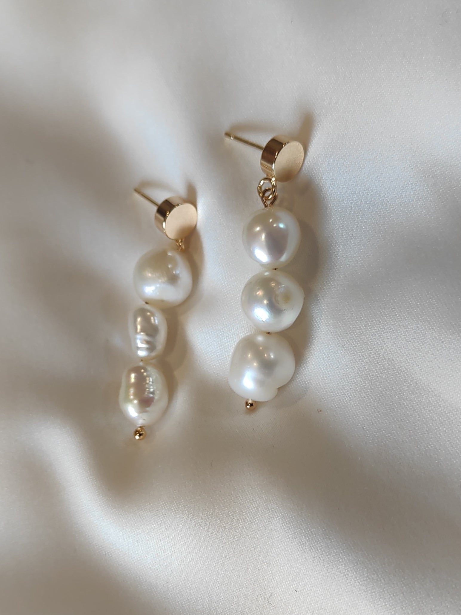 A trio of natural freshwater pearls suspended from a fixed 18ct gold plated pin and hook earring. A simple elegant choice to treasure and wear time and time again.