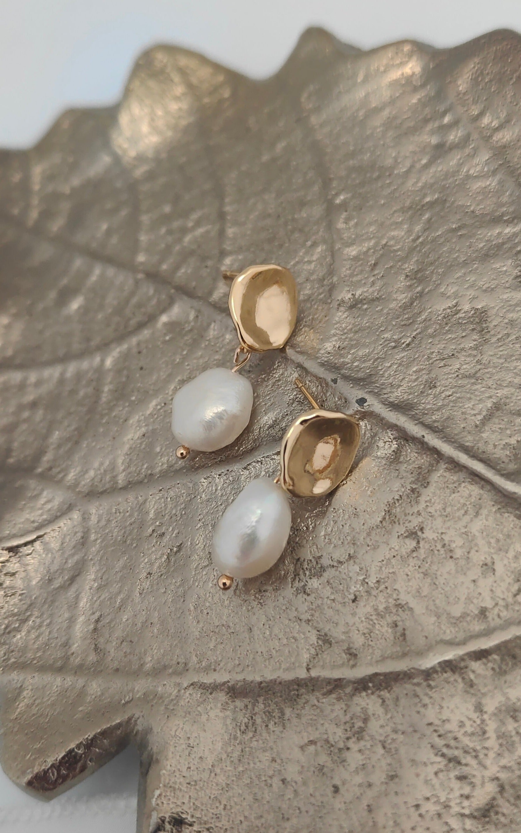 A 14mm freshwater ivory pearl suspended from an 18ct gold plated waved disc stud.