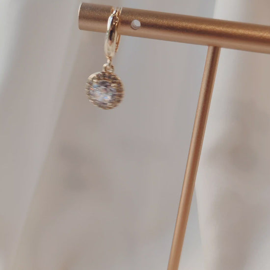 A sparking cubic zirconia stone on a paved halo setting suspended on an 18ct gold plated hoop earring.